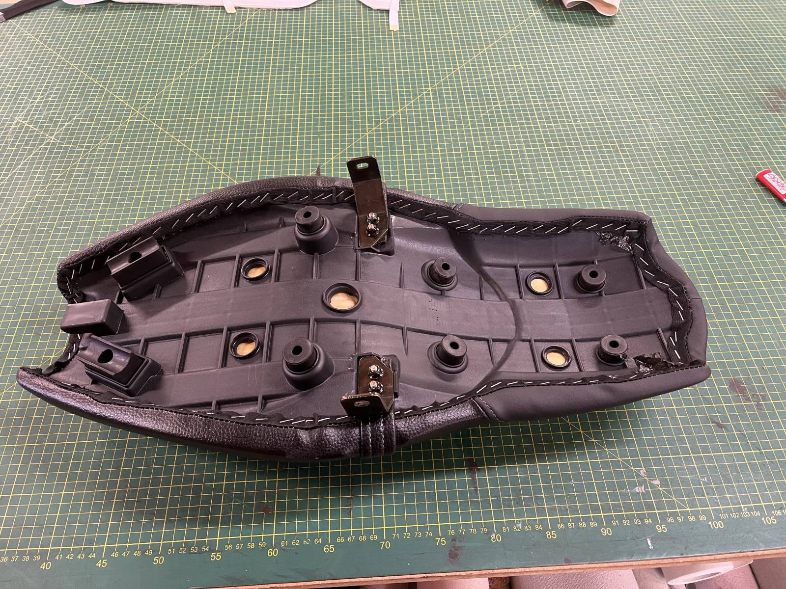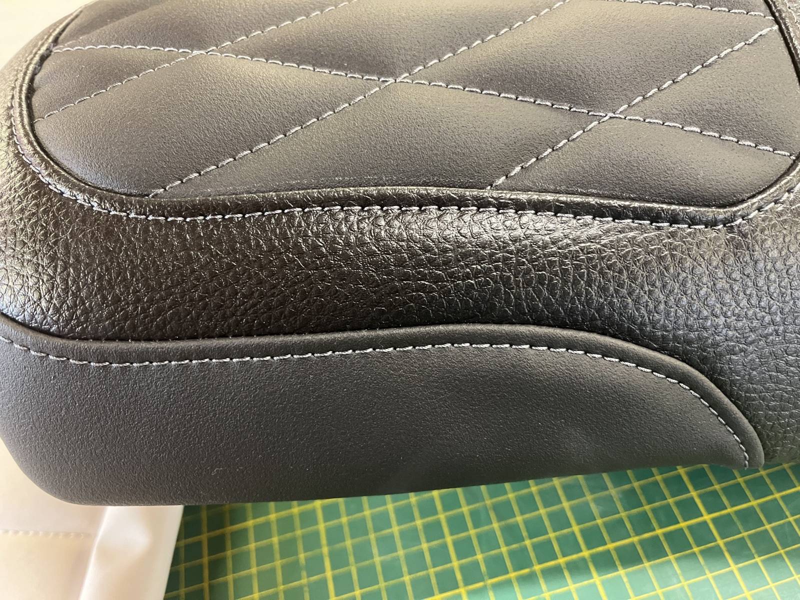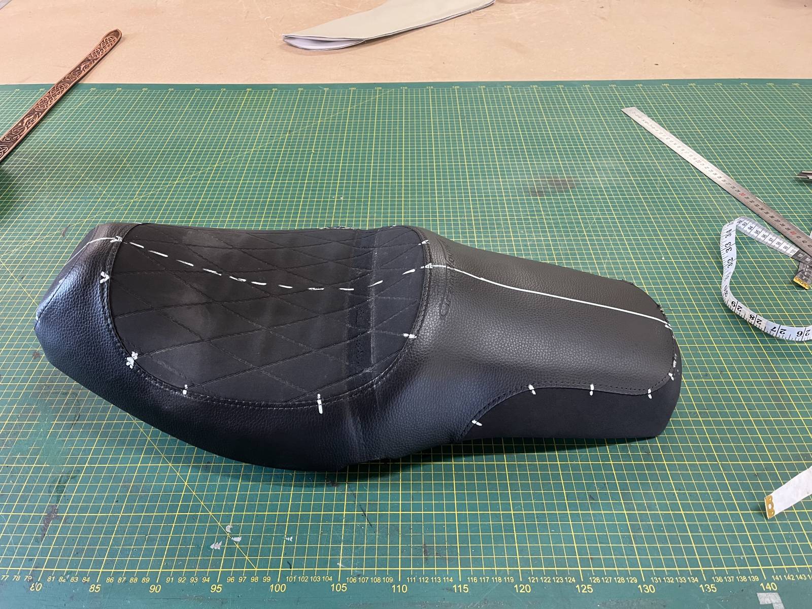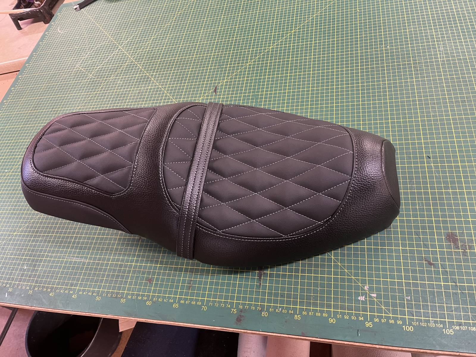 Le client souhaitait changer la matière de l'assise de sa selle moto et l'atelier Sellerie de Caux lui a proposé un simili cuir granité permettant de ne pas glisser.