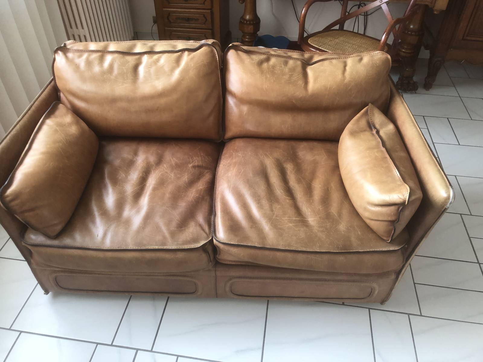 La cliente a deux canapés en cuir qui ont subi une décoloration due au soleil ainsi que des griffures de chat.