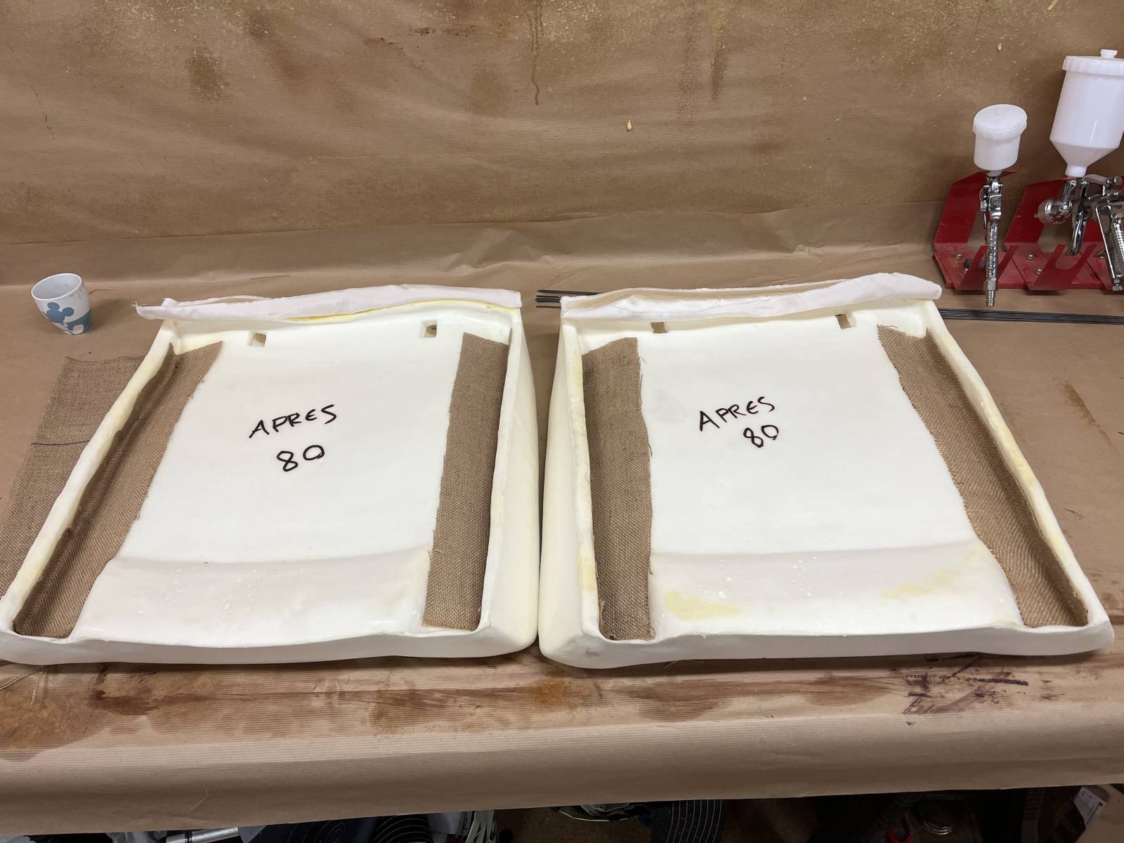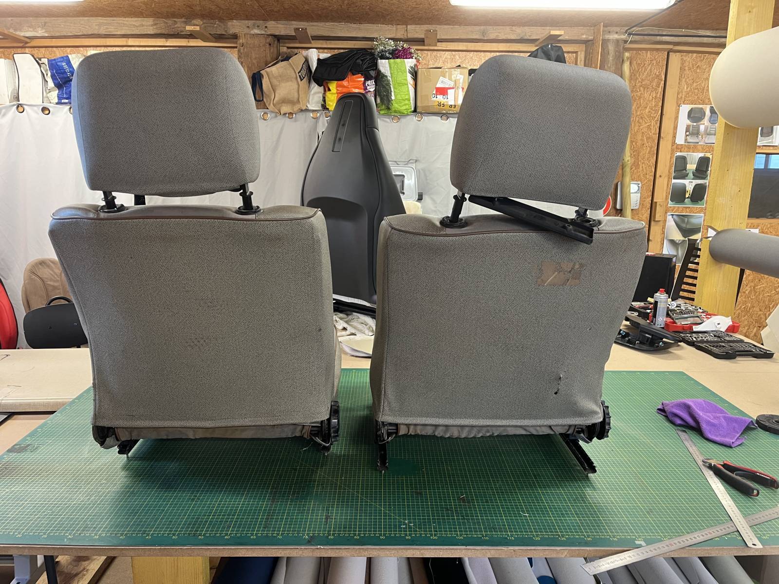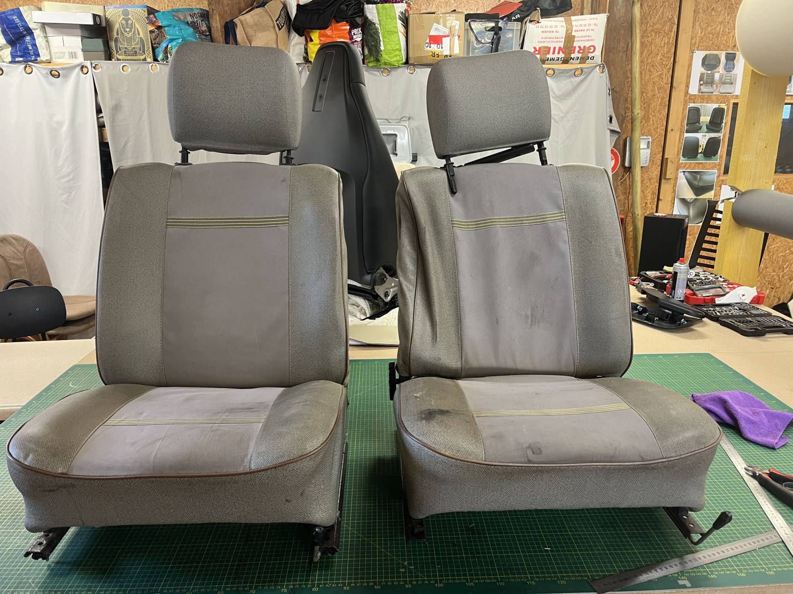Les parties arrières des sièges avant étant eux avec des accrocs, l'atelier Sellerie de Caux à proposé de les refaire avec un simili cuir d'une couleur grise pouvant s'accordé avec celui-d'origine.