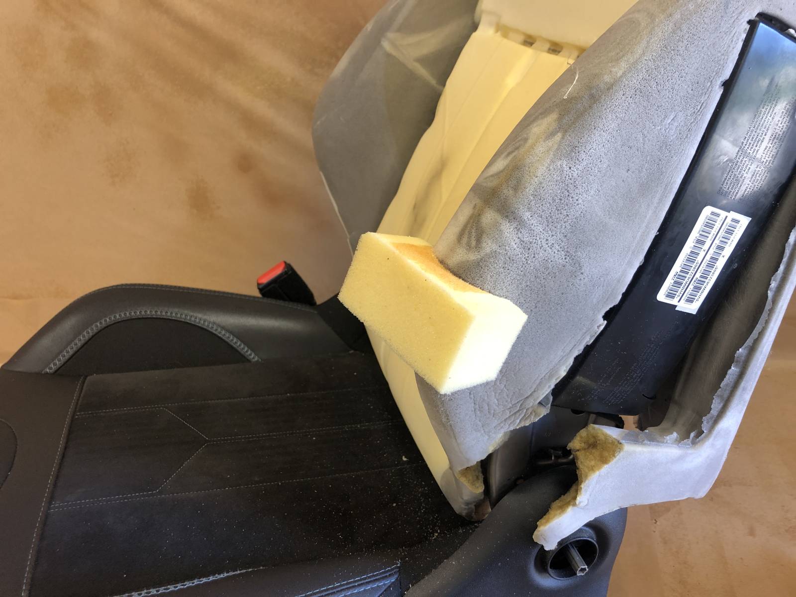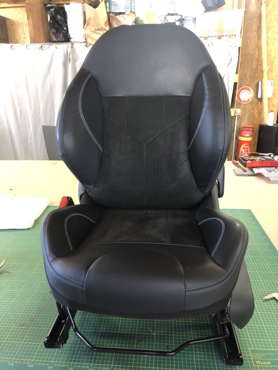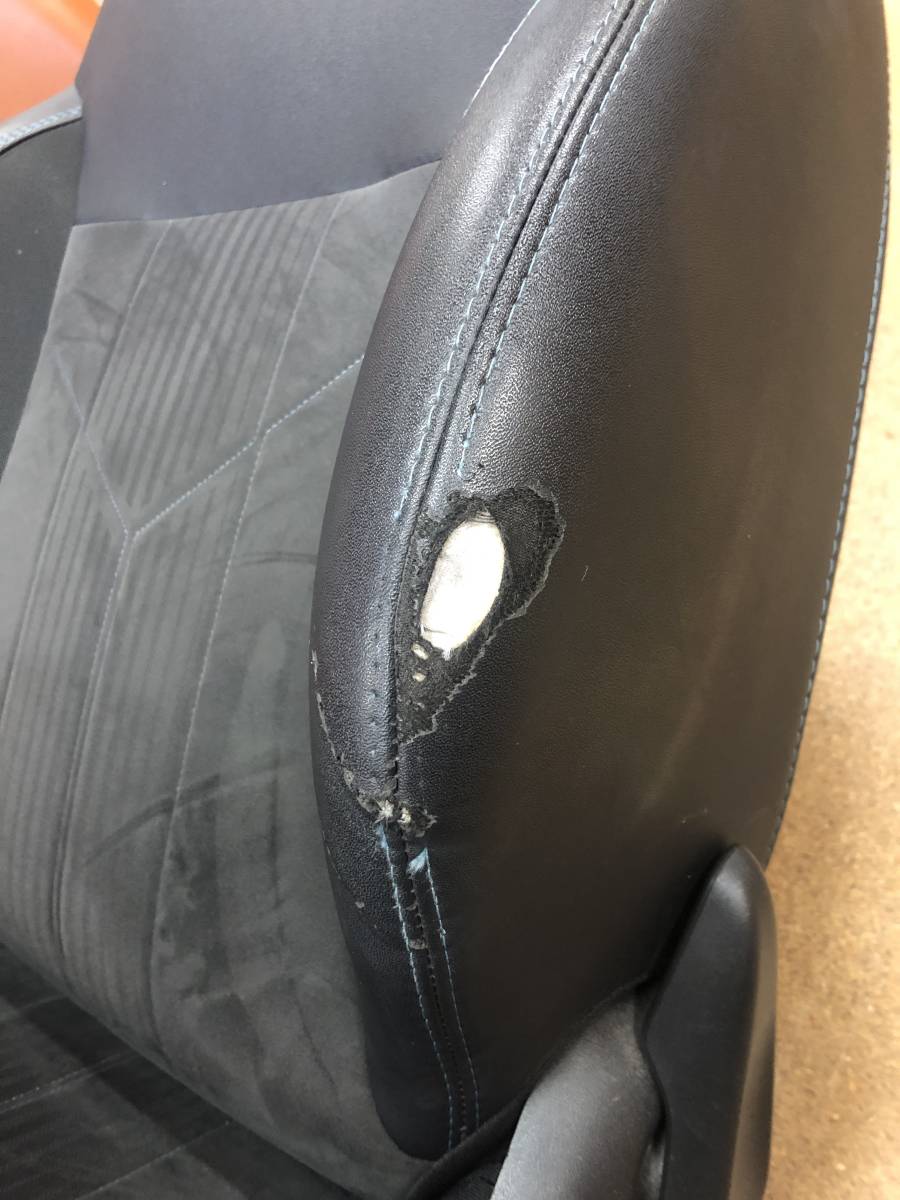 Pour un véhicule d'occasion vendu par un professionnel, l'atelier Sellerie de Caux a effectuer une réparation sur le dossier du siège conducteur avec la réalisation d'une greffe de mousse et des surpiqûres de décoration à l'identique avant de livrer le véhicule au client.